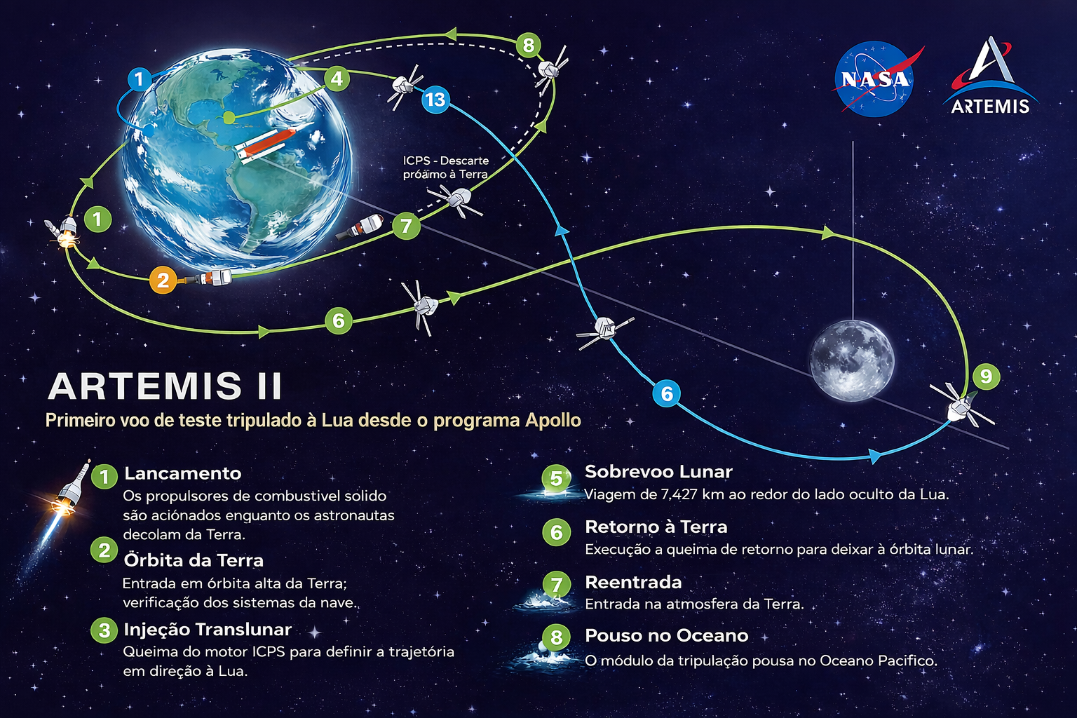 4. Retorno e Amerissagem: A gravidade lunar guiará a nave de volta à Terra, onde ela entrará na atmosfera a 40.000 km/h antes de cair no Oceano Pacífico.