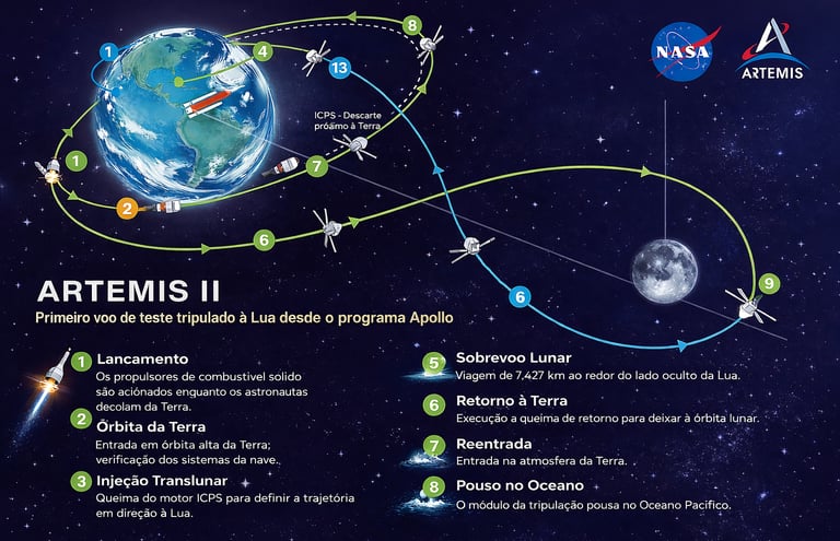 Diferente das futuras missões, a Artemis II não pousará na Lua. O objetivo é realizar um sobrevoo lunar utilizando uma trajetória de retorno livre.