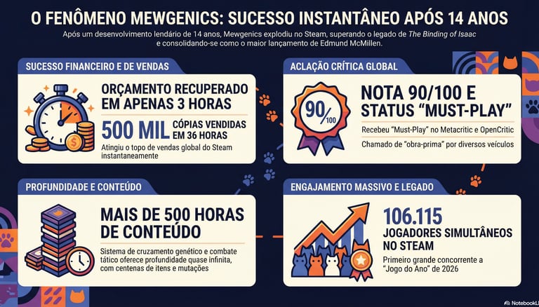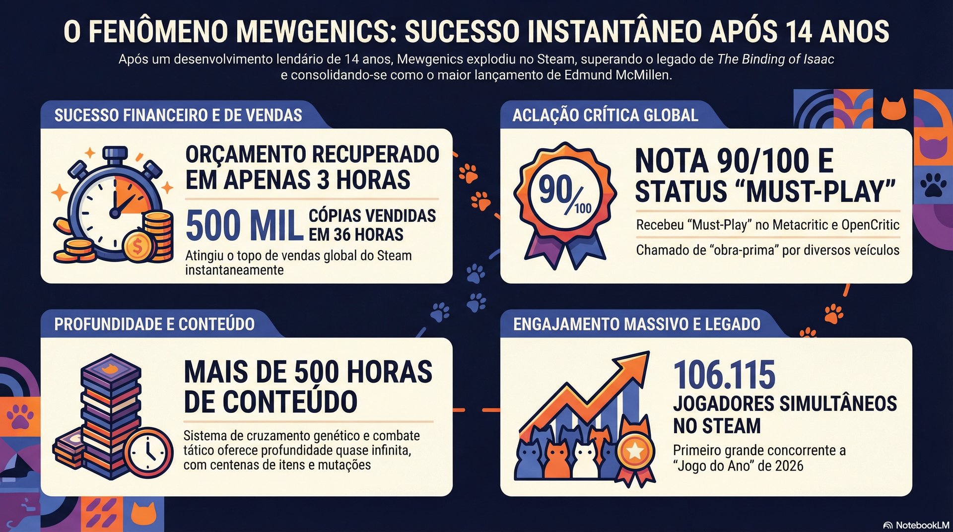 Após uma espera de quase uma década e meia, Mewgenics finalmente foi lançado em 10 de fevereiro de 2026, tornando-se instantaneamente um sucesso absoluto na Steam. Desenvolvido por Edmund McMillen (criador de The Binding of Isaac e Super Meat Boy) e Tyler Glaiel, o jogo mistura RPG tático, roguelike e simulação de vida em uma experiência descrita como "caótica e surpreendente".