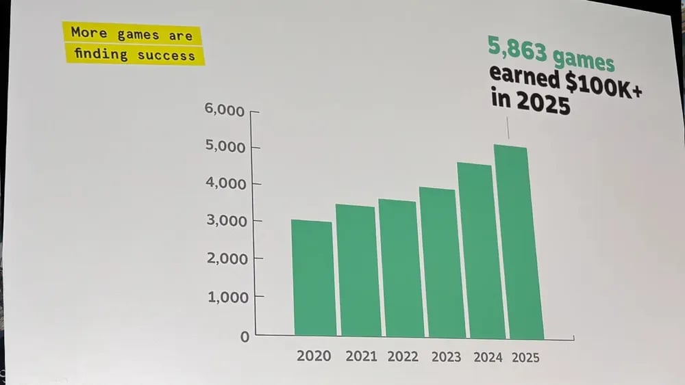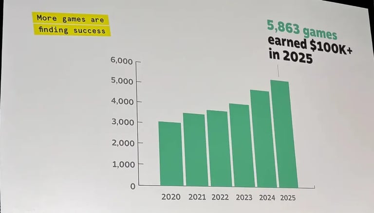 O dado mais impactante revelado pela Valve é que quase 6.000 jogos (exatamente 5.863) faturaram pelo menos US$ 100.000 no Steam apenas em 2025. Esse número vem crescendo de forma constante desde 2020, o que prova que, embora a concorrência seja feroz, a "fatia do bolo" está sendo distribuída para mais criadores.