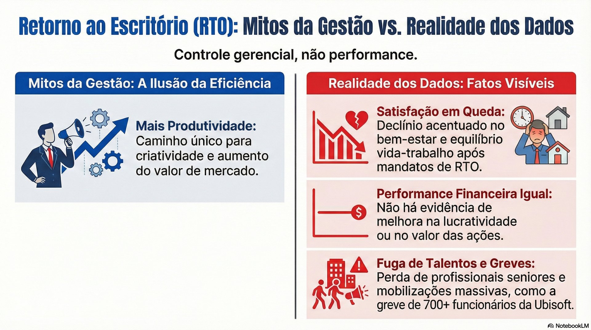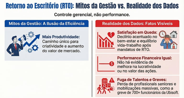 No entanto, essa visão é contestada por dados acadêmicos. De acordo com um estudo da University of Pittsburgh presente nas fontes, mandatos de retorno ao escritório (RTO) são frequentemente usados por gestores para reafirmar controle sobre os empregados ou como um "bode expiatório" para o mau desempenho financeiro da empresa.