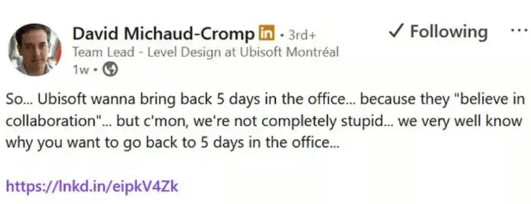 Em setembro de 2024, a Ubisoft anunciou uma mudança drástica: todos os funcionários deveriam retornar ao escritório pelo menos três dias por semana. A decisão foi tomada sem consulta prévia aos representantes dos trabalhadores, que argumentam que muitos colegas reconstruíram suas vidas (família, moradia e parentalidade) com base no modelo remoto dos últimos cinco anos.